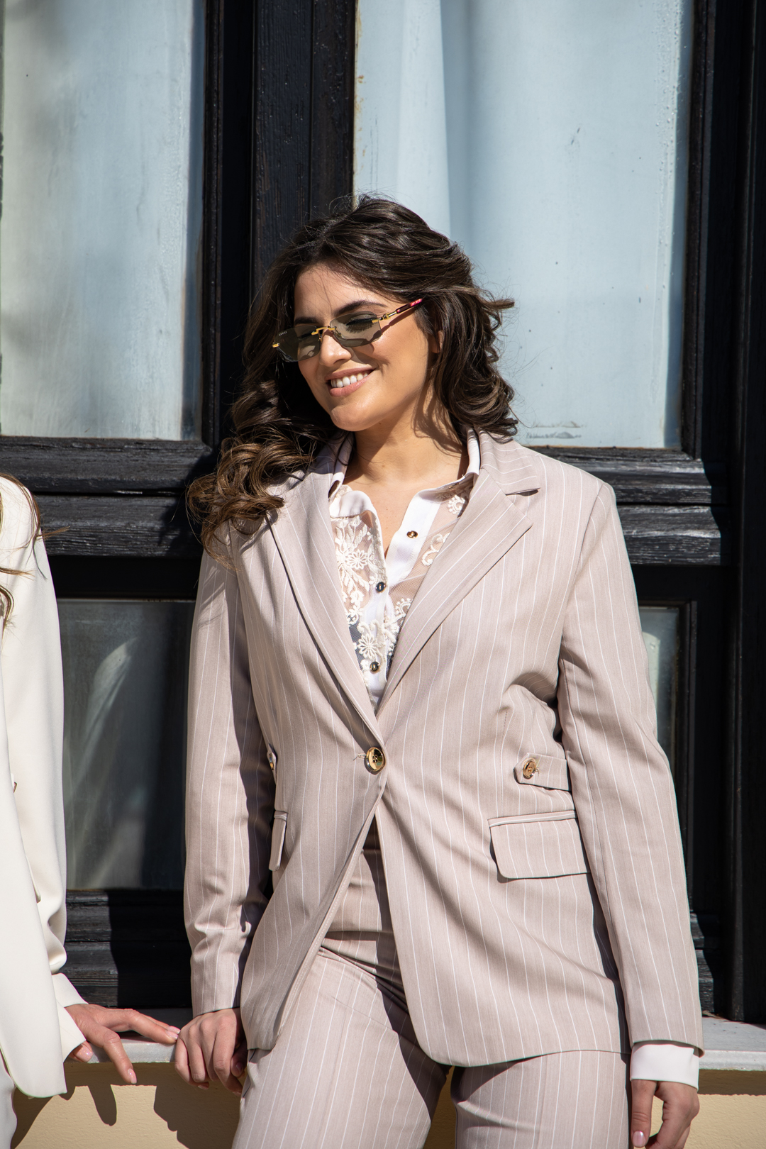 Σακάκι T/R ριγέ 472 522 με παντελόνα 282 522 και πουκάμισο tulle κέντημα 576 522